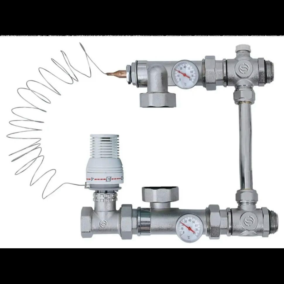 Насосно-смесительный узел TIM JH-1032 представляет собой готовый комплект арматуры (без насоса), предназначенный для создания принудительной циркуляции, регулировки и поддержания заданной температуры в системе водяной теплый пол.