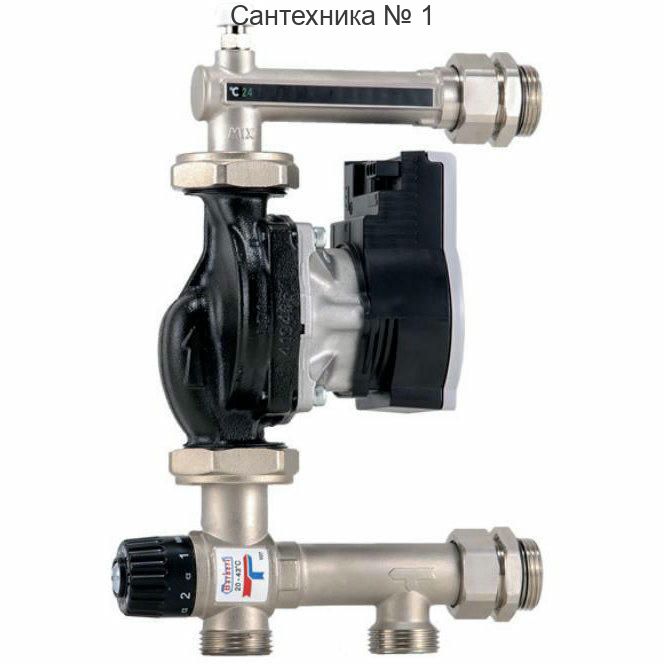 Насосно-смесительный узел STOUT SDG-0120-005001 Италия предназначен для приготовления теплоносителя в системах водяных теплых полов. Регулирование температуры происходит путем подмеса жидкости из обратной линии. Регулирование происходит с помощью двухходового клапана, установленного в подающем коллекторе и управляемым термостатической головкой с выносным погружным датчиком, который размещен на выходе смесительного узла (при использовании контроллера отопления функция управления клапаном передается ему). Балансировочный клапан в линии подмеса задает соотношение теплоносителя, поступающего из обратной линии вторичного контура и прямой линии первичного.
