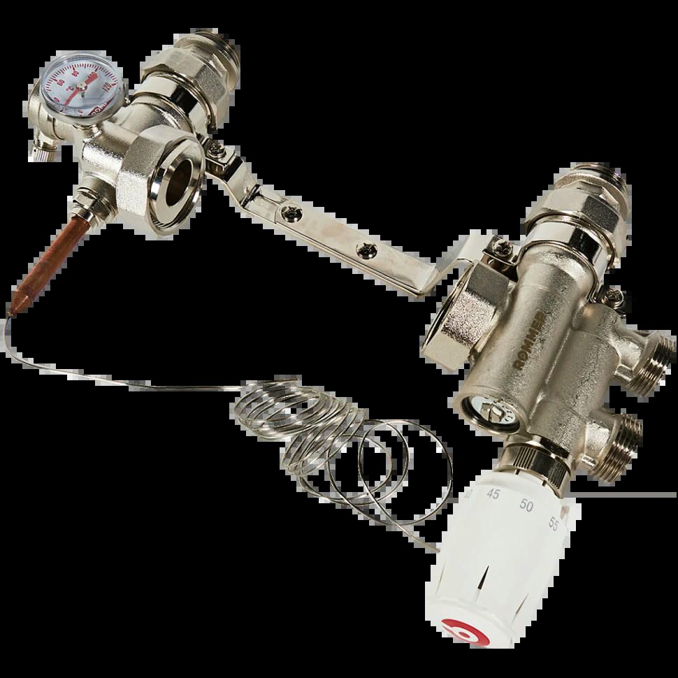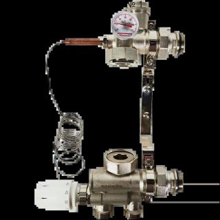 Насосно-смесительный узел ROMMER с термостатической головкой с выносным датчиком - изделие полной заводской готовности. Предназначен для создания в системе отопления здания циркуляционного контура с пониженной до настроечного значения температурой теплоносителя, поддержания температуры и расхода теплоносителя на заданном уровне, обеспечения гидравлической балансировки высокотемпературного и низкотемпературного контуров. Узел применяется в системах встроенного водяного отопления ? теплые полы, теплые стены, обогрев теплиц и открытых площадок.