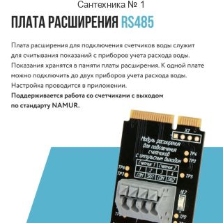 Плата расширения для подключения счетчиков воды служит для считывания показаний с приборов учета расхода воды. Показания хранятся в памяти платы расширения. К одной плате расширения можно подключить до двух приборов учета расхода воды. Настройка производится в приложении. (поддерживается работа со счетчиками с выходом по стандарту NAMUR).