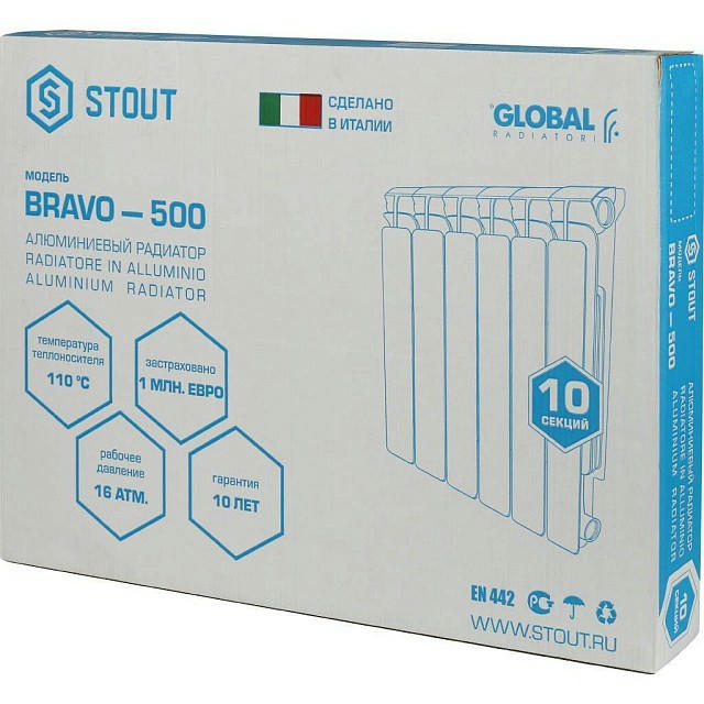 Радиатор алюминиевый секционный BRAVO 500 10 секций, боковое подключение, белый STOUT