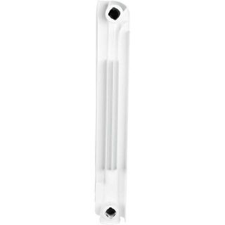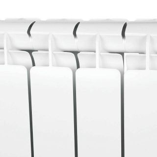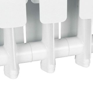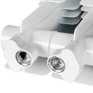 Радиаторы STOUT Bravo собираются из отдельных секций, которые изготавливаются из качественного алюминиевого сплава методом литья под давлением. Каждая секция представляет собой единый монолит из двух коллекторов и связывающего их оребрения, внутри которого проходит вертикальный канала овального сечения. Особая форма оребрения и канала обеспечивают высокие теплотехнические показатели радиатора и низкое гидравлическое сопротивление. В отверстиях коллекторов выполнена трубная резьба размером 1". Резьба служит для соединения секций между собой в радиаторы различной длины с помощью стальных резьбовых ниппелей. Геометрия ниппельных соединений и параметры прокладок гарантируют надежную герметичность собранного радиатора. Наружная поверхность секции радиатора окрашена порошковой эмалью белого цвета.