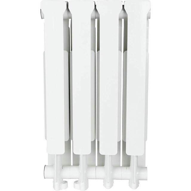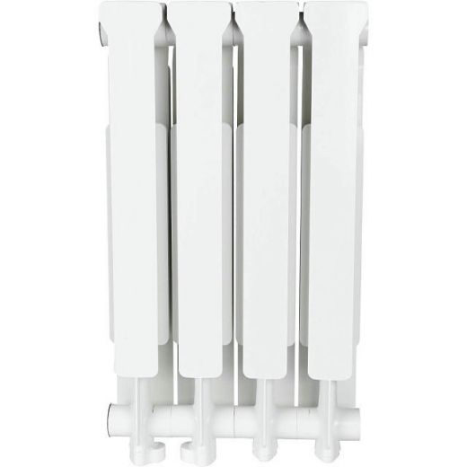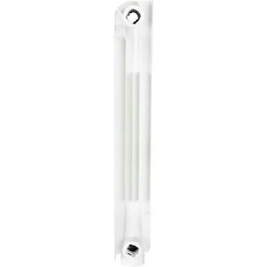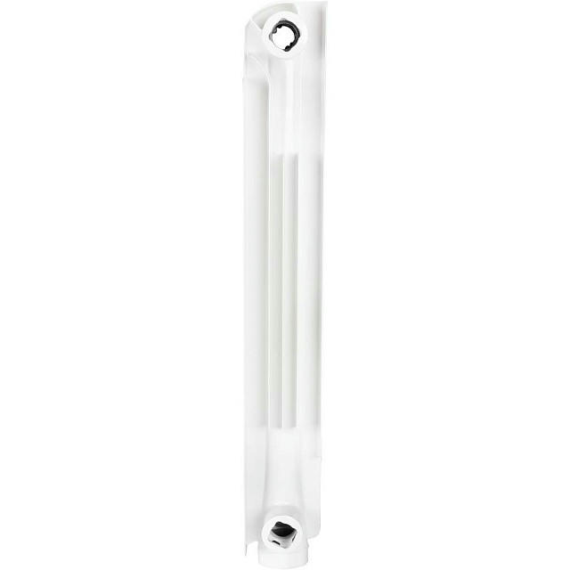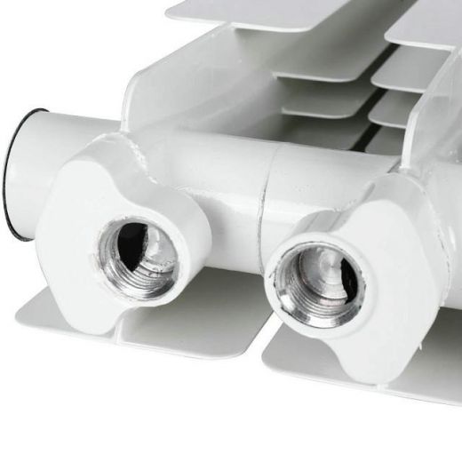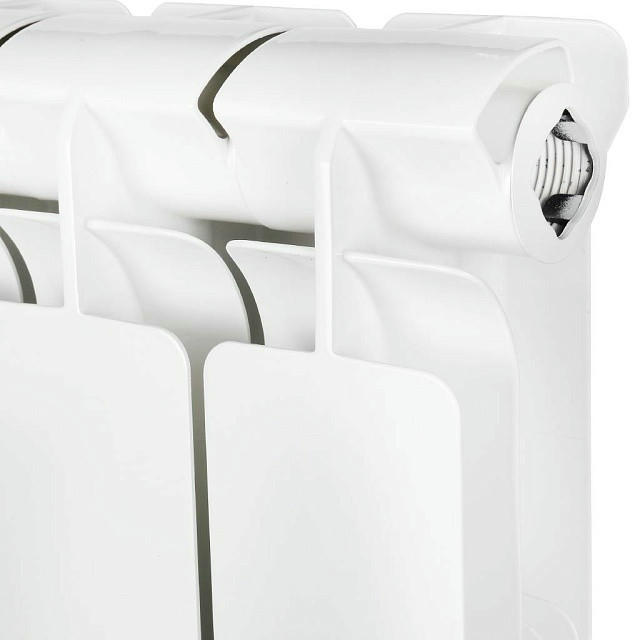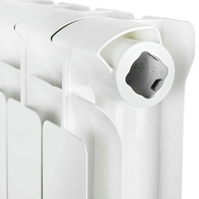 Радиаторы STOUT Bravo собираются из отдельных секций, которые изготавливаются из качественного алюминиевого сплава методом литья под давлением. Каждая секция представляет собой единый монолит из двух коллекторов и связывающего их оребрения, внутри которого проходит вертикальный канала овального сечения. Особая форма оребрения и канала обеспечивают высокие теплотехнические показатели радиатора и низкое гидравлическое сопротивление. В отверстиях коллекторов выполнена трубная резьба размером 1". Резьба служит для соединения секций между собой в радиаторы различной длины с помощью стальных резьбовых ниппелей. Геометрия ниппельных соединений и параметры прокладок гарантируют надежную герметичность собранного радиатора. Наружная поверхность секции радиатора окрашена порошковой эмалью белого цвета.