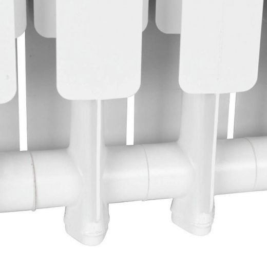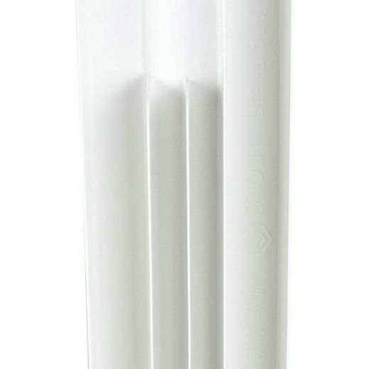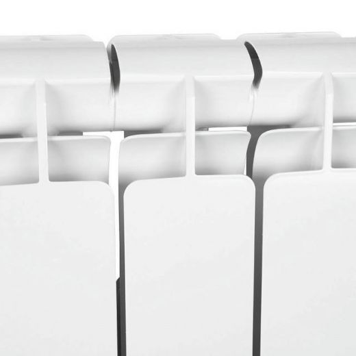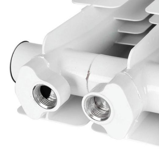 Радиаторы STOUT Bravo собираются из отдельных секций, которые изготавливаются из качественного алюминиевого сплава методом литья под давлением. Каждая секция представляет собой единый монолит из двух коллекторов и связывающего их оребрения, внутри которого проходит вертикальный канала овального сечения. Особая форма оребрения и канала обеспечивают высокие теплотехнические показатели радиатора и низкое гидравлическое сопротивление. В отверстиях коллекторов выполнена трубная резьба размером 1". Резьба служит для соединения секций между собой в радиаторы различной длины с помощью стальных резьбовых ниппелей. Геометрия ниппельных соединений и параметры прокладок гарантируют надежную герметичность собранного радиатора. Наружная поверхность секции радиатора окрашена порошковой эмалью белого цвета.