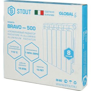 Радиатор алюминиевый секционный BRAVO 500 8 секций, боковое подключение, белый STOUT