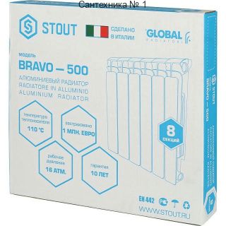Радиатор алюминиевый секционный BRAVO 500 8 секций, боковое подключение, белый STOUT