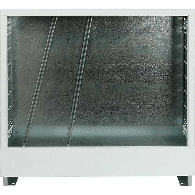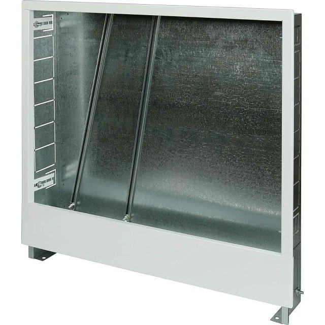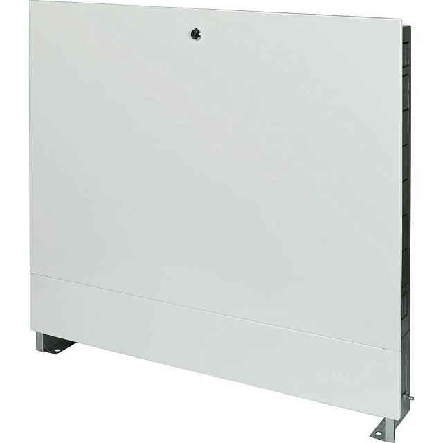 Шкаф распределительный встроенный 8-10 выхода ШРВ-3 STOUT предназначен для размещения в них распределительных коллекторов и коллекторных блоков для систем отопления. Шкаф выполнен из оцинкованной стали, окрашен порошковой краской RAL 9016 с предварительным нанесением фосфатной пленки для придания антикоррозионных свойств изделию. В боковых стенках корпуса шкафа выполнена перфорация, сегменты которой удаляются в любом удобном месте для подсоединения трубопроводов. Шкаф имеет регулировку по высоте до 40 мм за счет выдвижных ножек. Внутри шкафа установлены универсальные профильные крепления, позволяющие располагать оборудование по всей высоте и ширине шкафа. Шкаф оснащен внутренним замком.