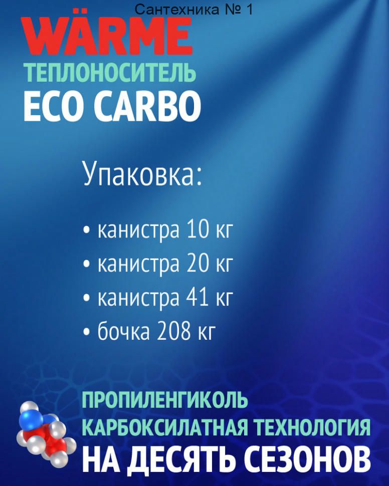 Теплоноситель (антифриз) Warme Eco Carbo 30 ? десятилетний, экологически безопасный, предназначен для использования в системах отопления открытого и закрытого типа, а также в качестве рабочей жидкости в теплообменных аппаратах, работающих при низких температурах.