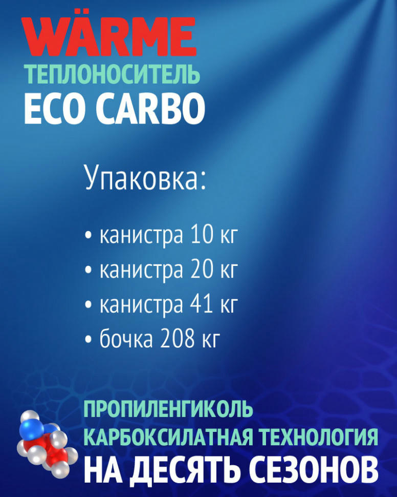 Теплоноситель (антифриз) Warme Eco Carbo 30 ? десятилетний, экологически безопасный, предназначен для использования в системах отопления открытого и закрытого типа, а также в качестве рабочей жидкости в теплообменных аппаратах, работающих при низких температурах.