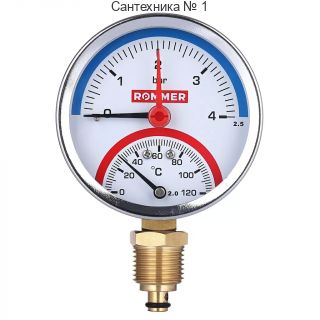 Термоманометр радиальный с запорным клапаном Rommer - 1/2* (D-80 мм, шкала 0-10 бар / 0-120 °С)