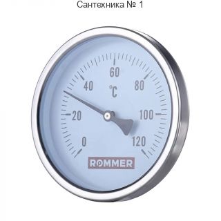 Термометр биметаллический с погружной гильзой Rommer - 1/2* (диаметр корпуса - 100 мм, длина гильзы - 100 мм, шкала 0-120 °С)