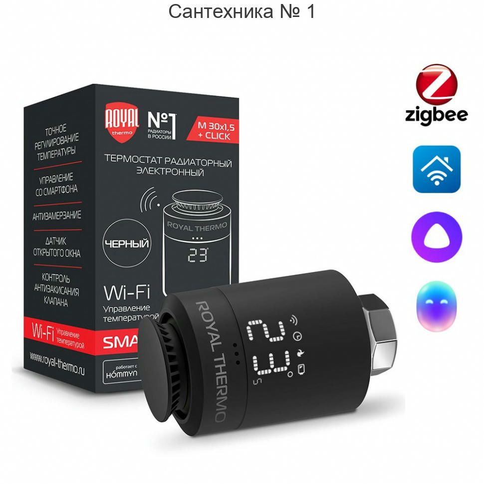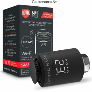 Термостат радиаторный электронный ROYAL THERMO Smart Heat с LED дисплеем и регулятором температуры. Точность установки температуры - 1°С. Термостат выполнен из высококачественного пластика и металла. Его назначение - регулировка температуры в комнате, при этом с возможностью управления теплом со смартфона.