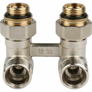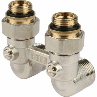 Блок шаровых кранов REHAU используется в системах отопления. Это пара шаровых кранов, применяющихся в качестве запорной арматуры и для соединения радиаторов с нижним подключением и соединительными стальными трубками из серий REHAU. Корпус - латунь, наружная поверхность - никелированная латунь. В комплект входят: угловой блок шаровых кранов с накидными гайками G 3/4", 2 соединительных ниппеля G 3/4" x G 1/2".