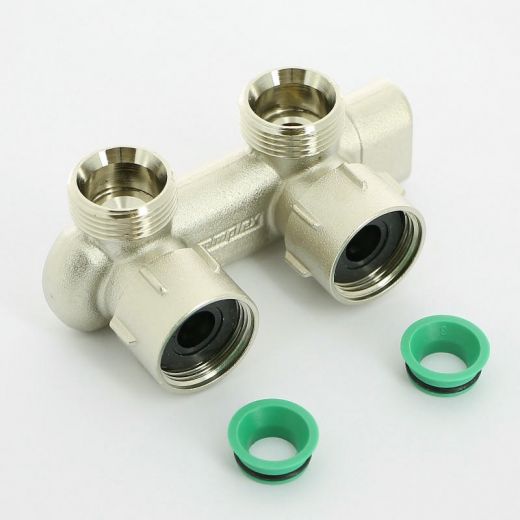 Оцените товар «Узел угловой перекрёстный E2/50 НВ 3/4" х 3/4" ЕК радиаторный со встроенными вентилями и адаптерами Simplex»